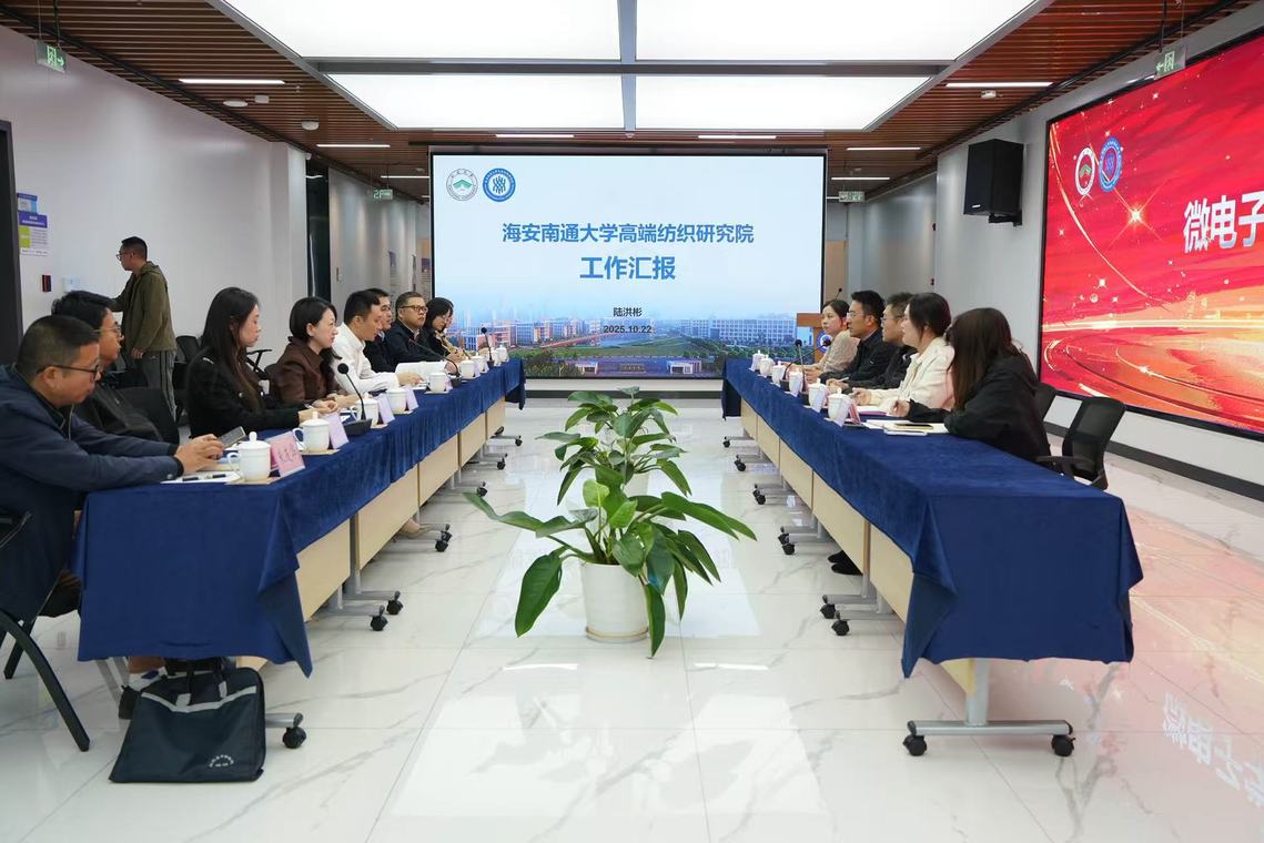 10 月 22 日上午,学院党总支书记金翼、副院长(主持工作)赵继聪带领班子成员及科研骨干等前往海安色情图 高端纺织研究院,就研究院建设规划、科研工作推进、产学研协同合作等内容开展学习交流。